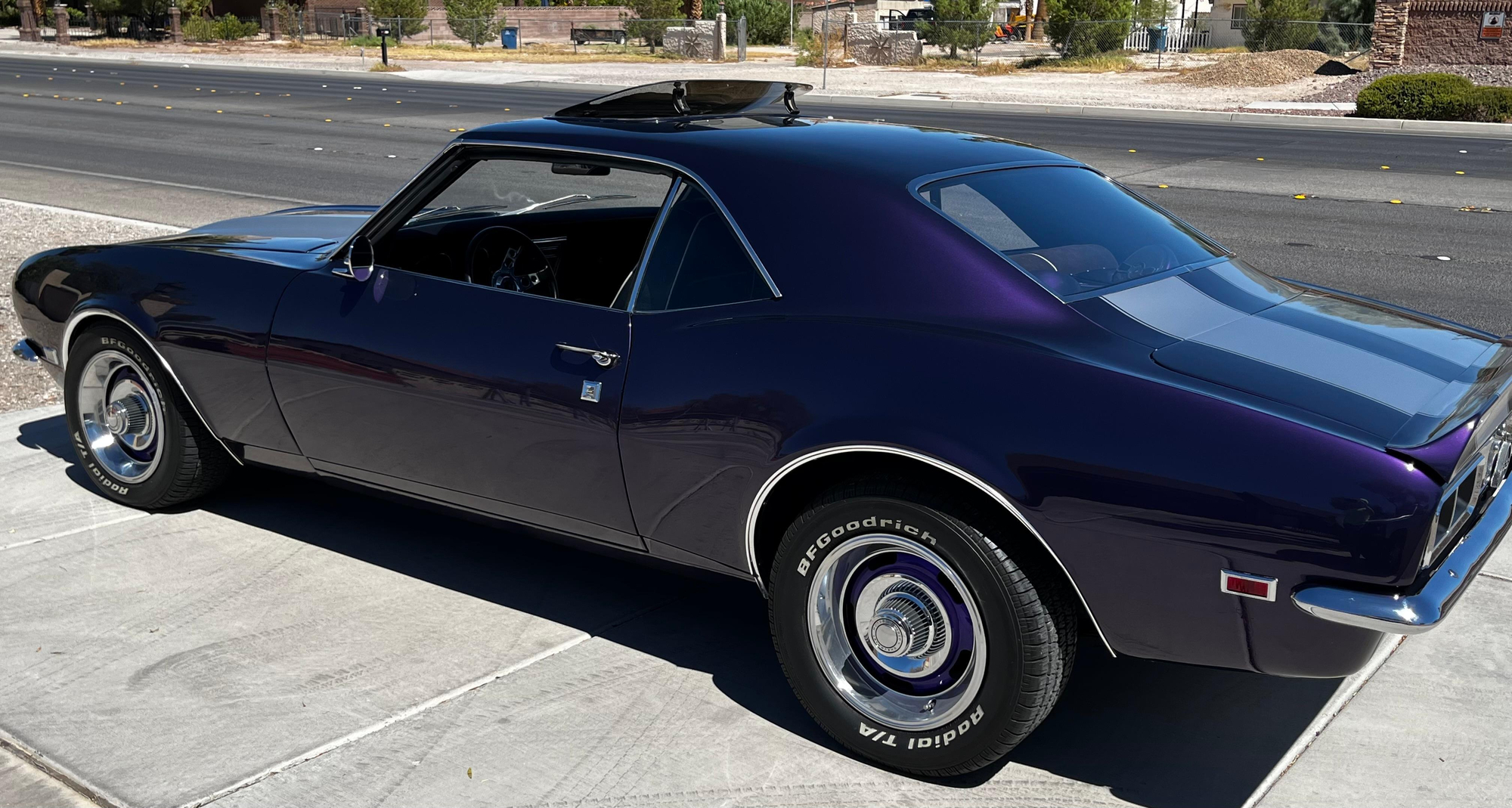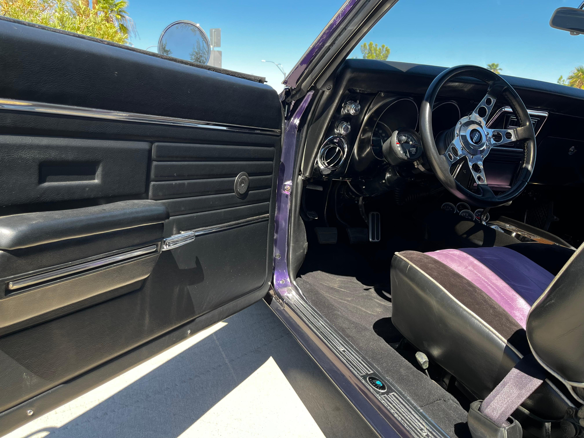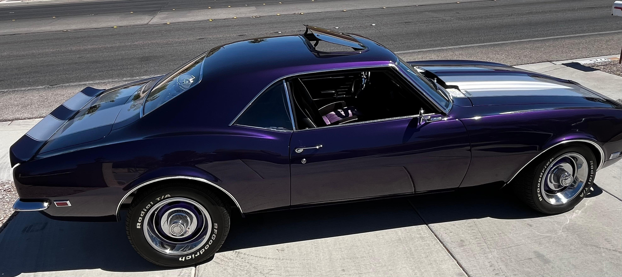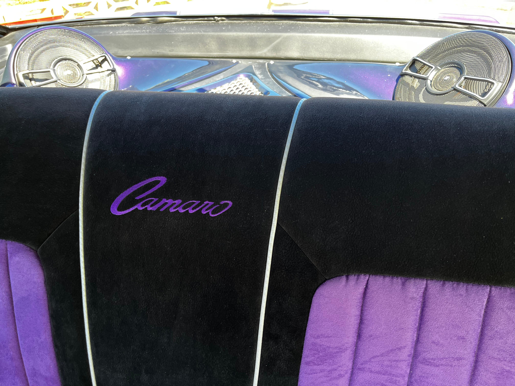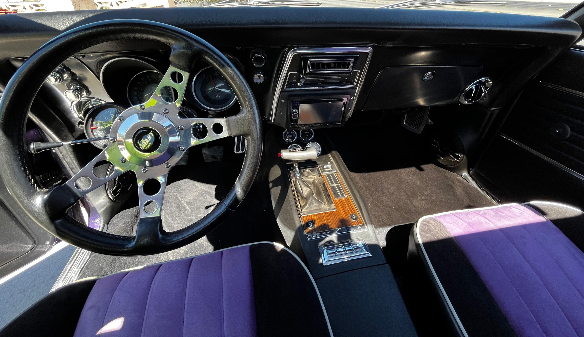– THIS… is a 1968 Chevrolet Camaro Coupe, finished in purple and silver with a black and purple interior.