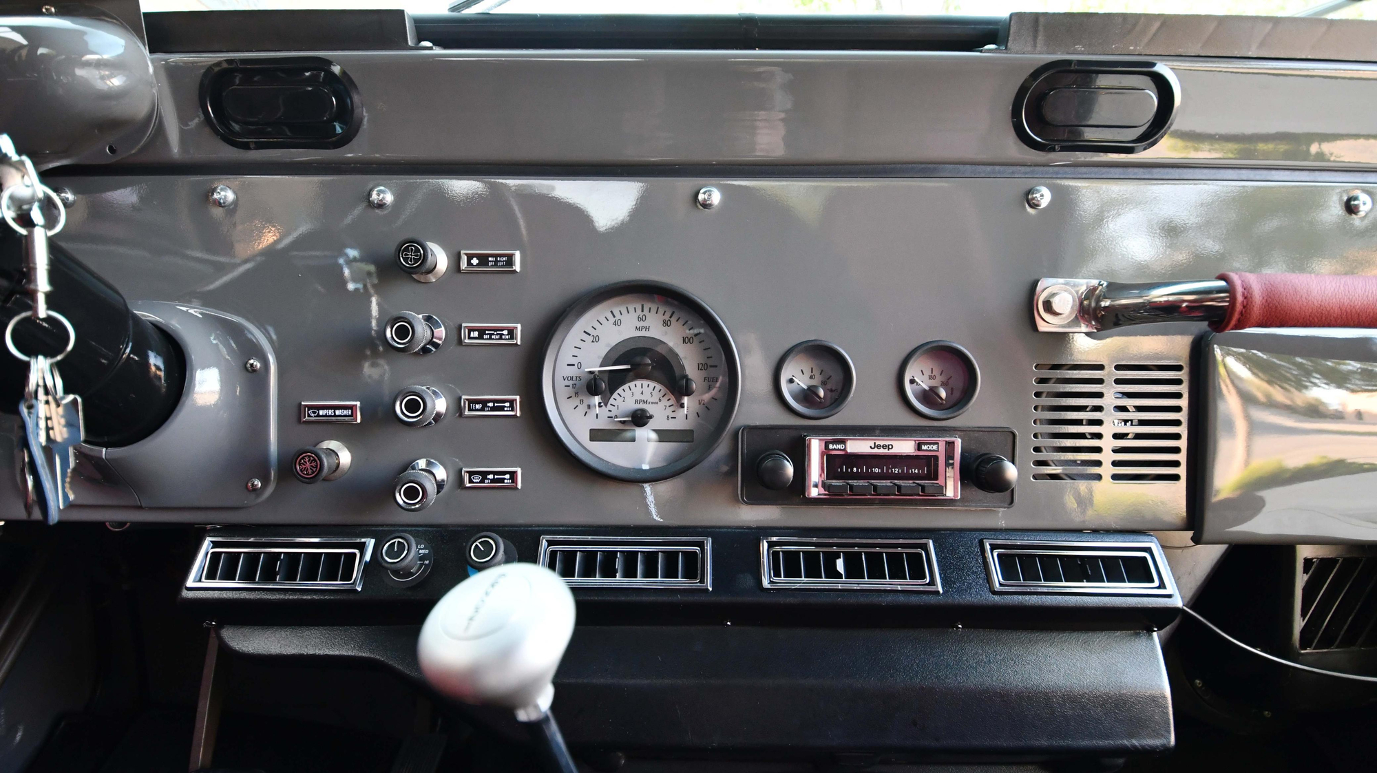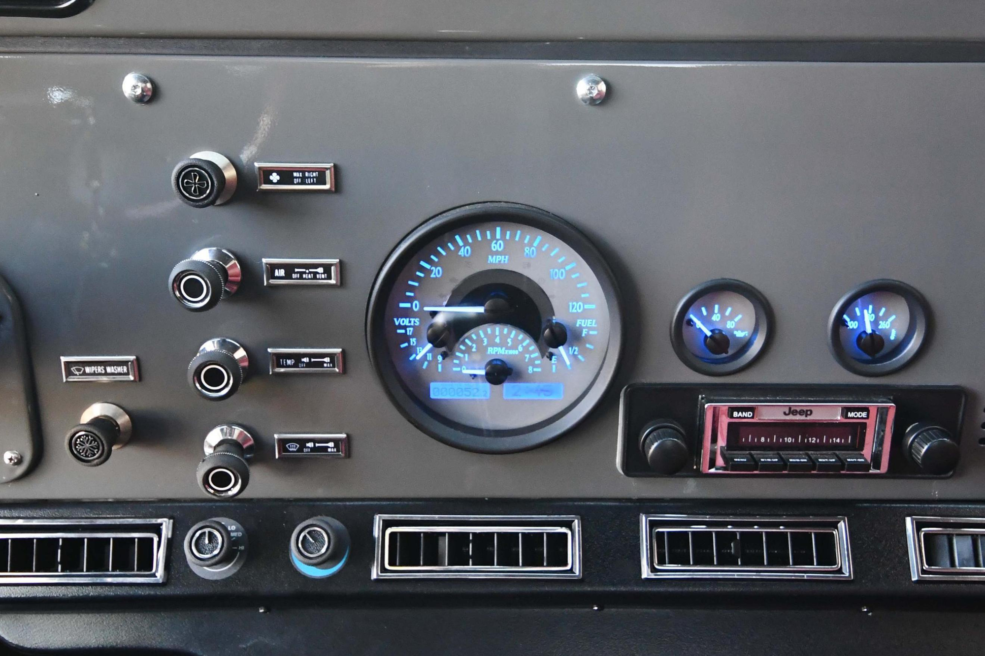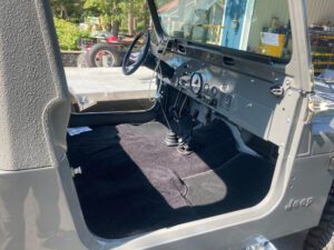 – This CJ-8’s factory-fitted instrument cluster has been replaced. The odometer currently displays about 60 miles, but the true mileage is unknown.