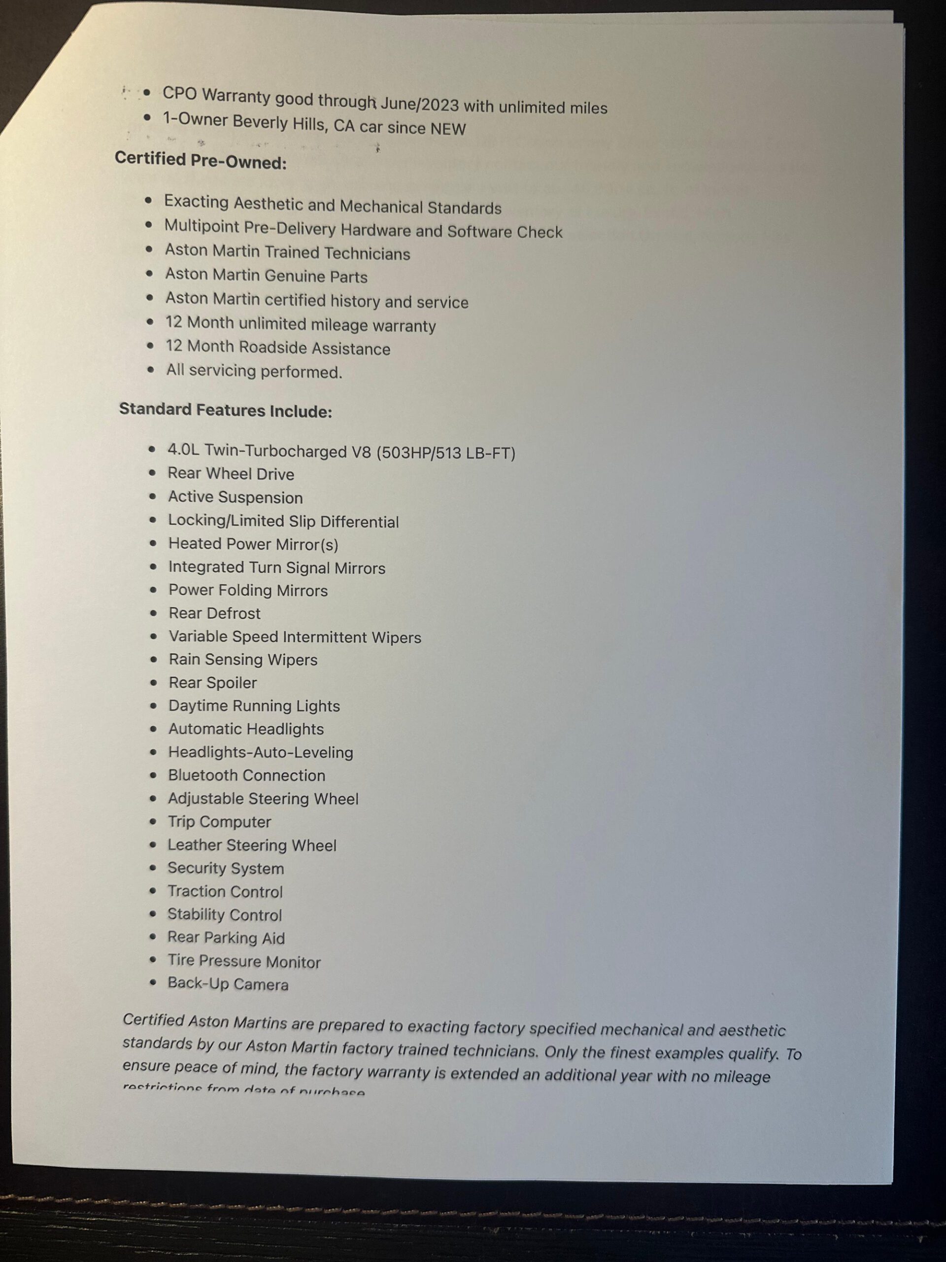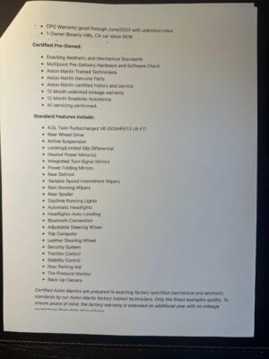 – A partial list of notable equipment reported by the seller includes the Dark Chrome Jewelry Package, 20-inch 10-spoke directional wheels, active suspension, Q by Aston Martin leather upholstery, power-adjustable and heated front seats, and more as detailed below. The seller reports no notable modifications.
