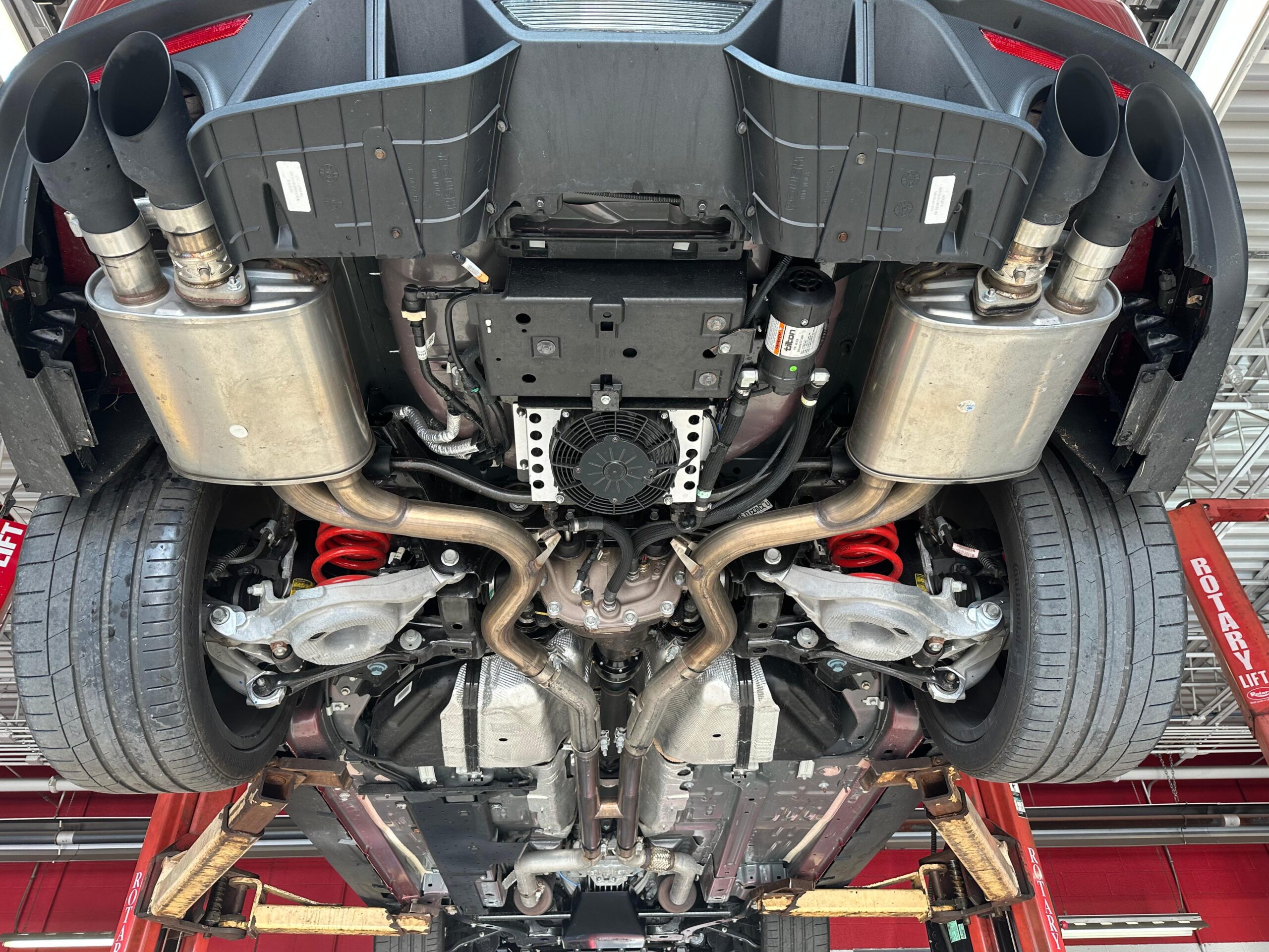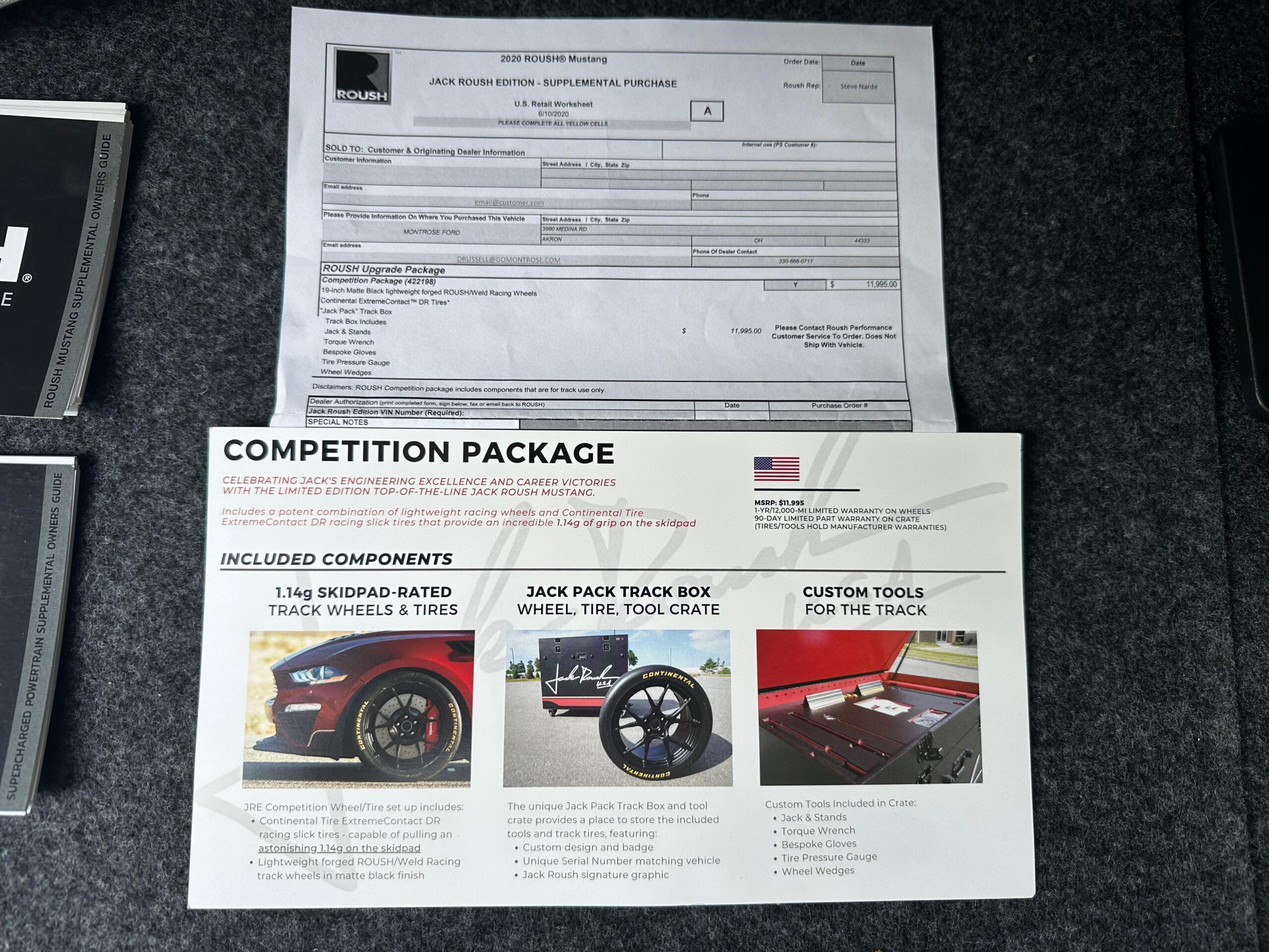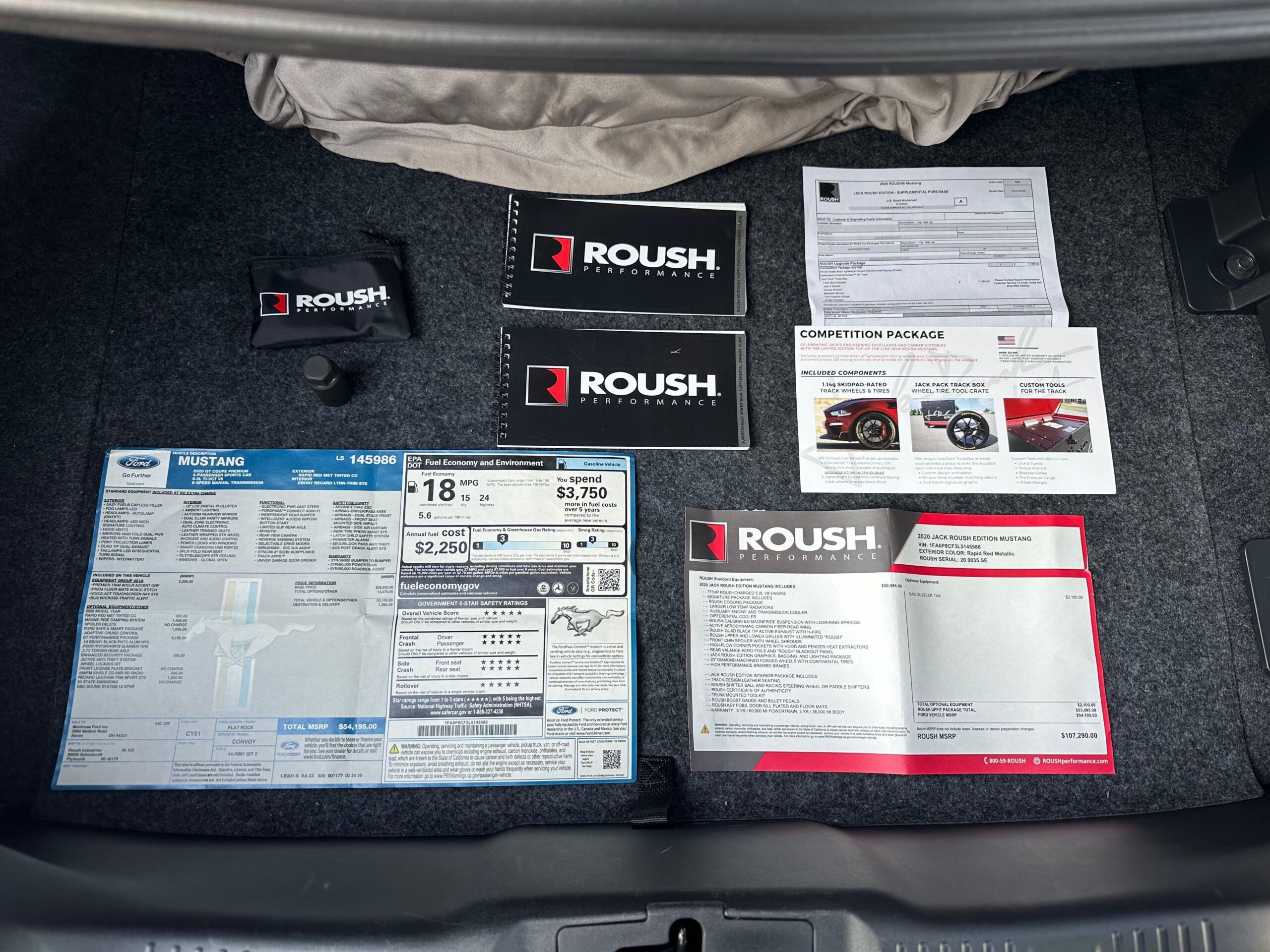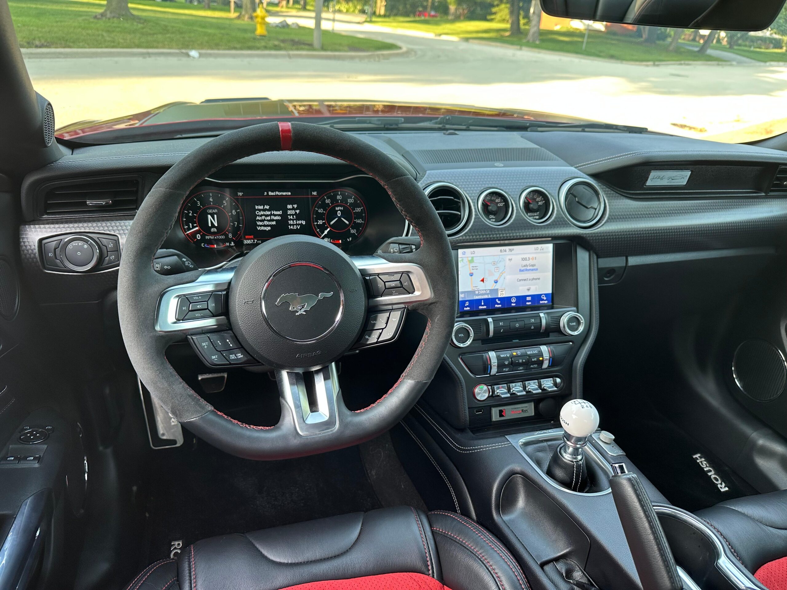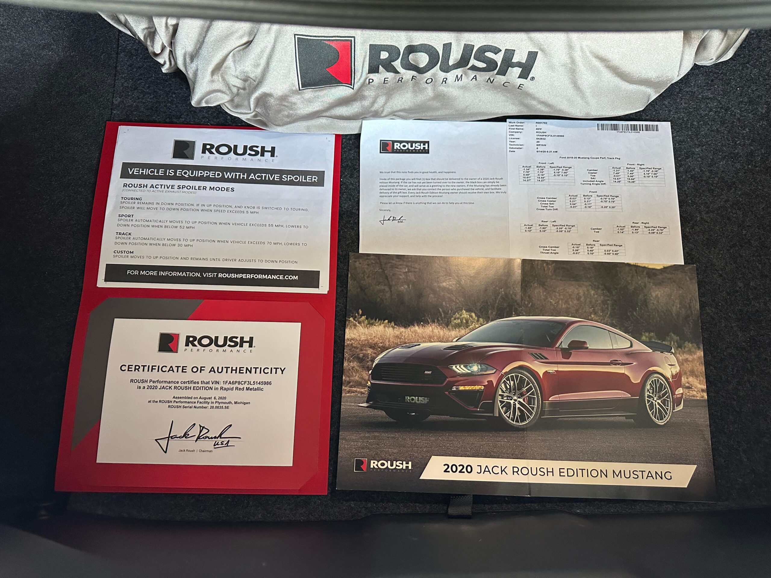 – According to Roush Performance documentation provided in the gallery, notable modifications include the Roush Cooling Package, 20-inch Diamond-machined forged wheels, Brembo brakes, Roush-calibrated Magneride suspension with lowering springs, active aerodynamic carbon fiber rear wing, Roush quad black tip active exhaust with H-pipe, track-design leather upholstery, a Roush boost gauge, and billet pedals.