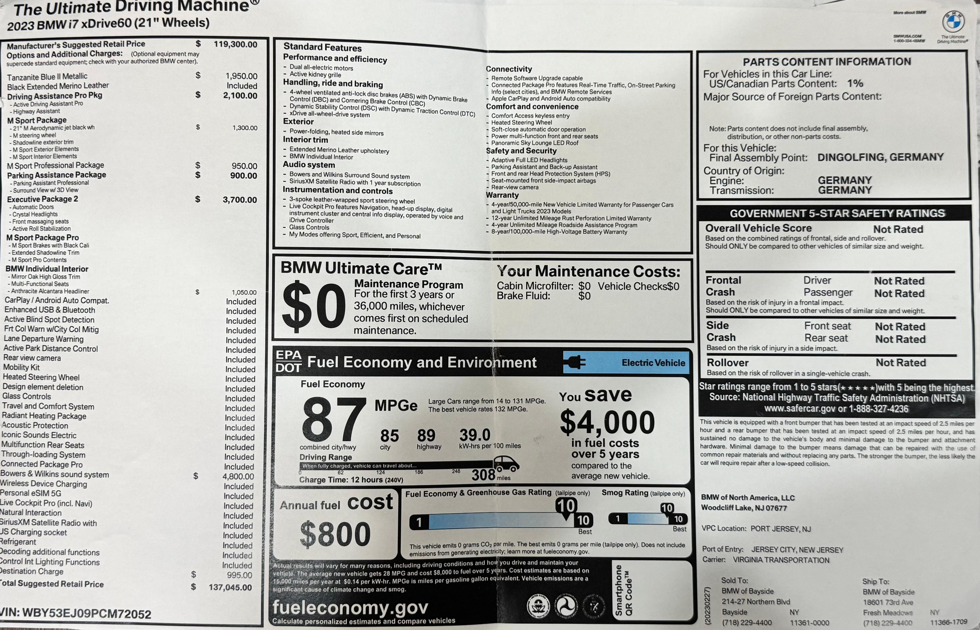 – According to the window sticker provided in the gallery, notable factory equipment includes the Executive 2, M Sport, M Sport Pro, Driving Assistance Pro, Parking Assistance, and BMW Individual Interior packages, extended Merino leather, and a Bowers & Wilkins sound system. The seller reports no notable modifications.