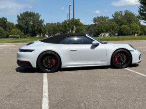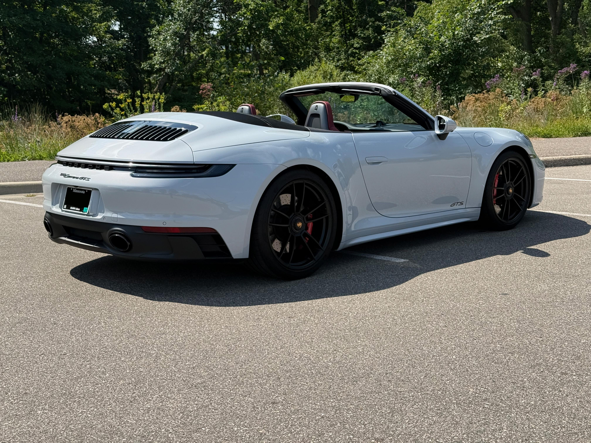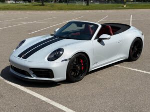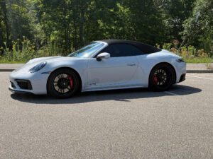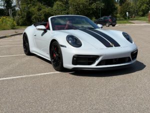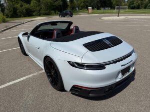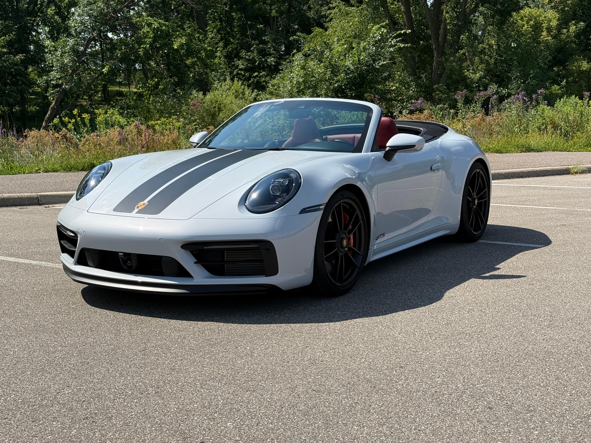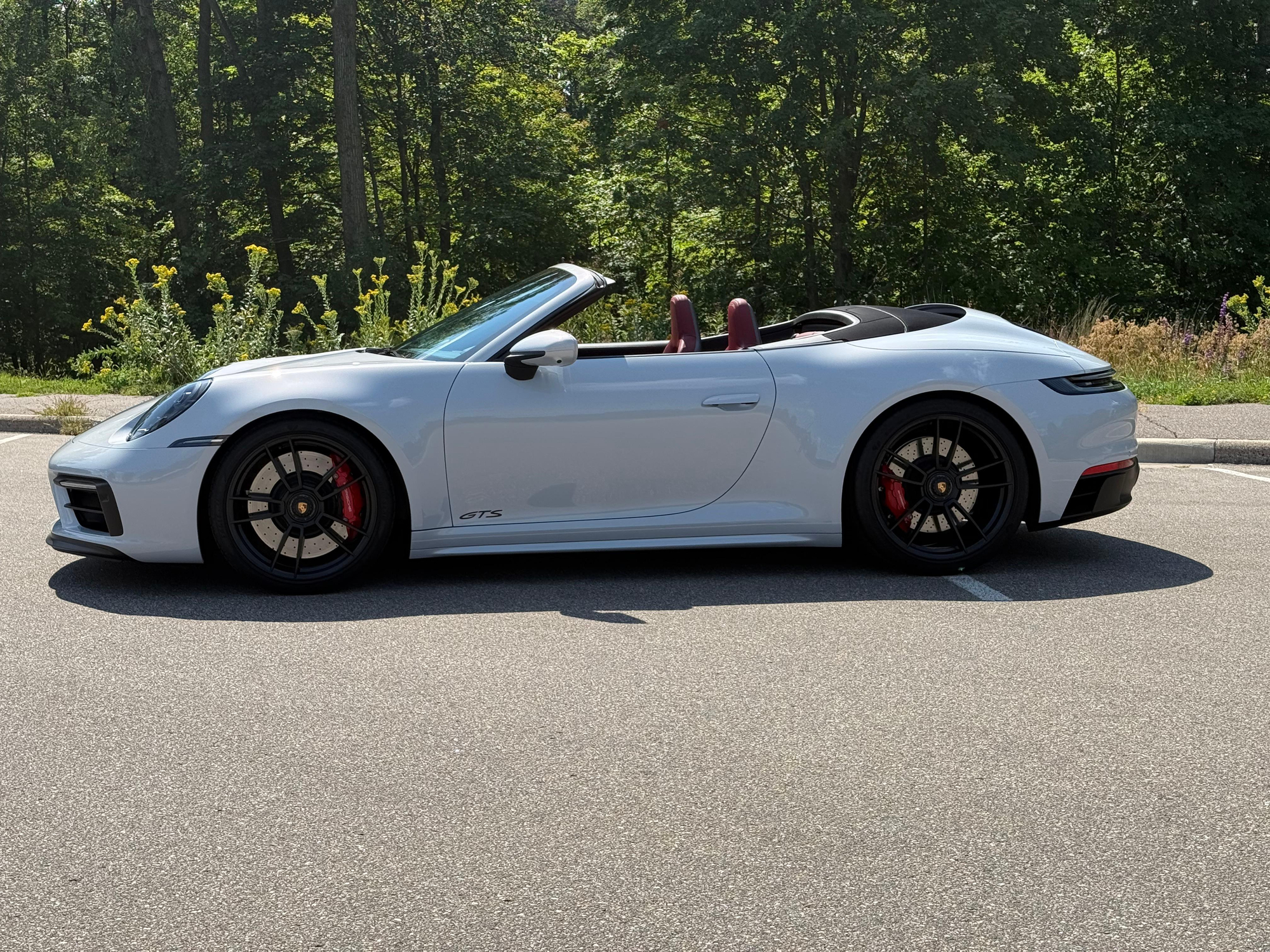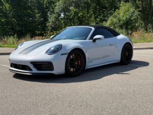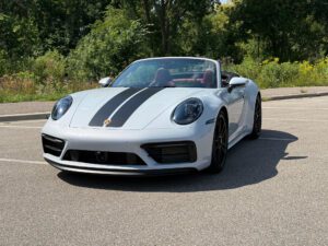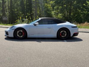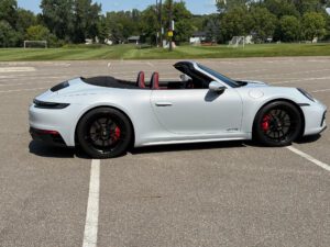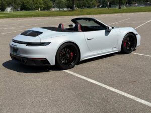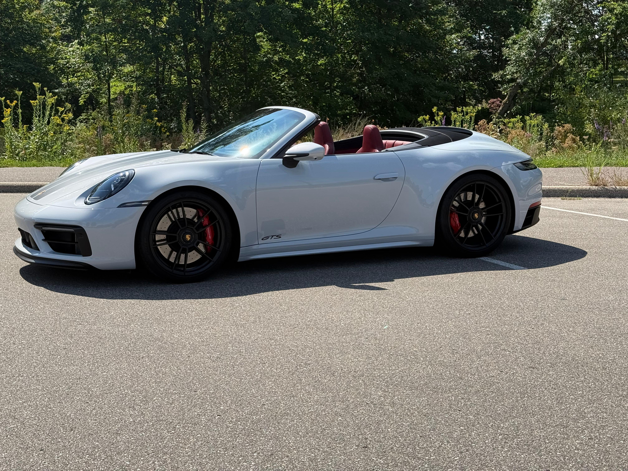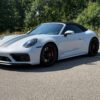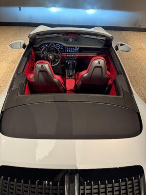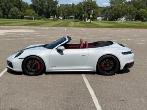 – THIS… is a 2023 Porsche 911 Carrera GTS Cabriolet, finished in Ice Grey Metallic with a black soft top and a Bordeaux Red and black interior.