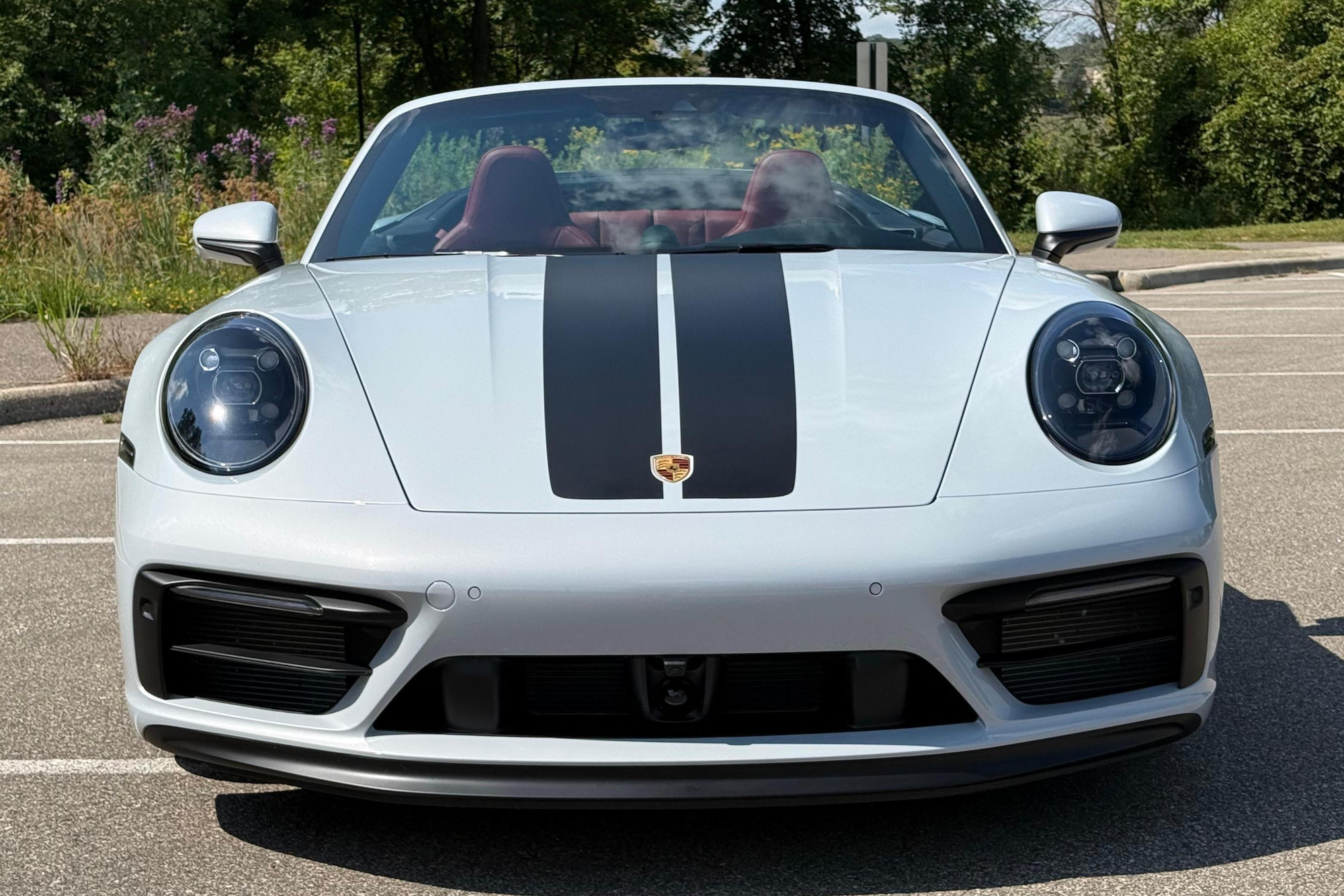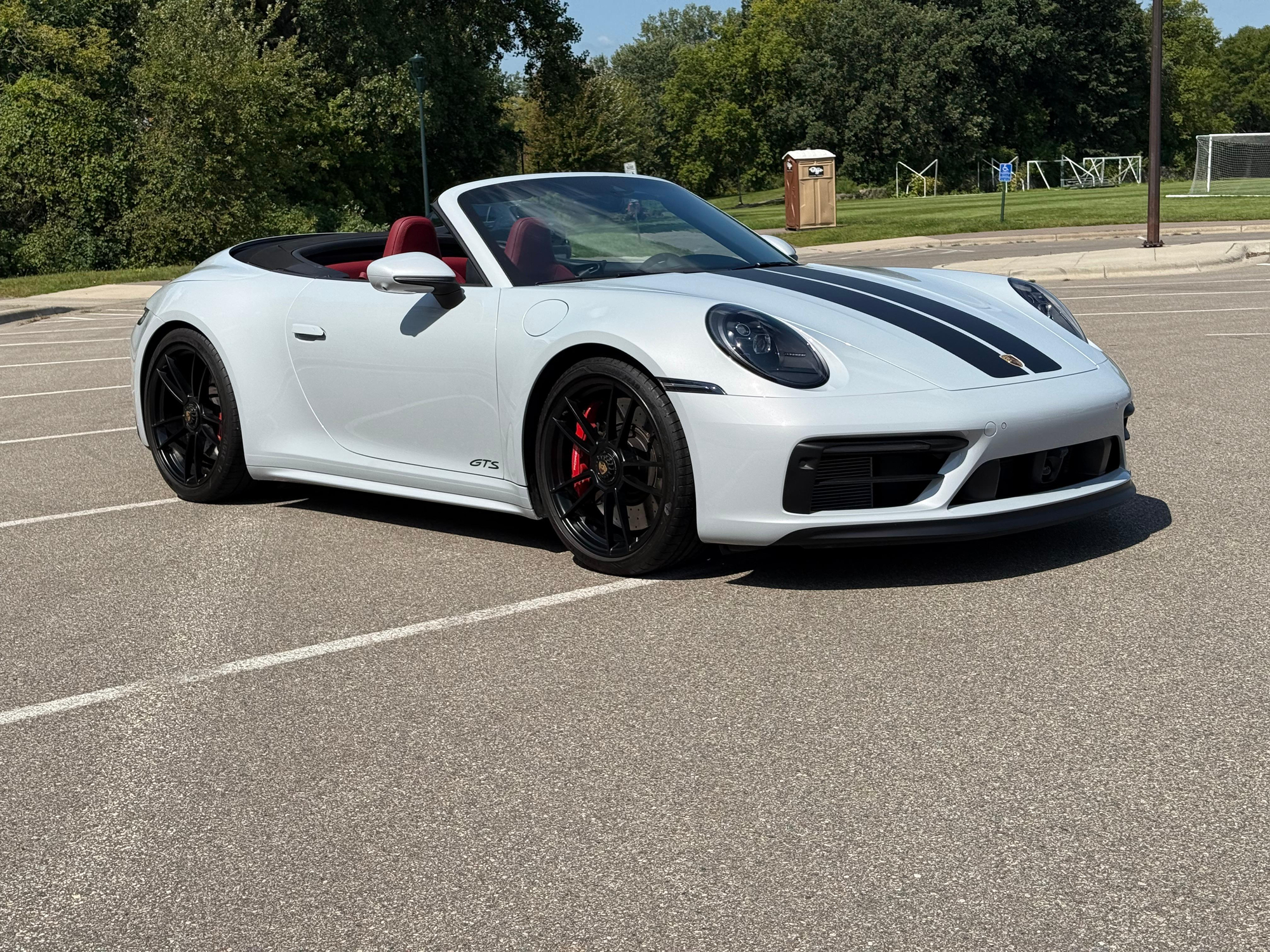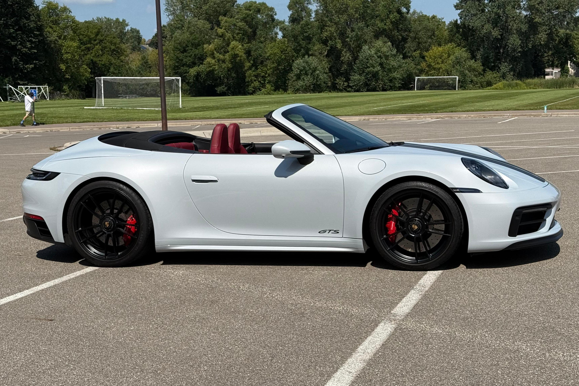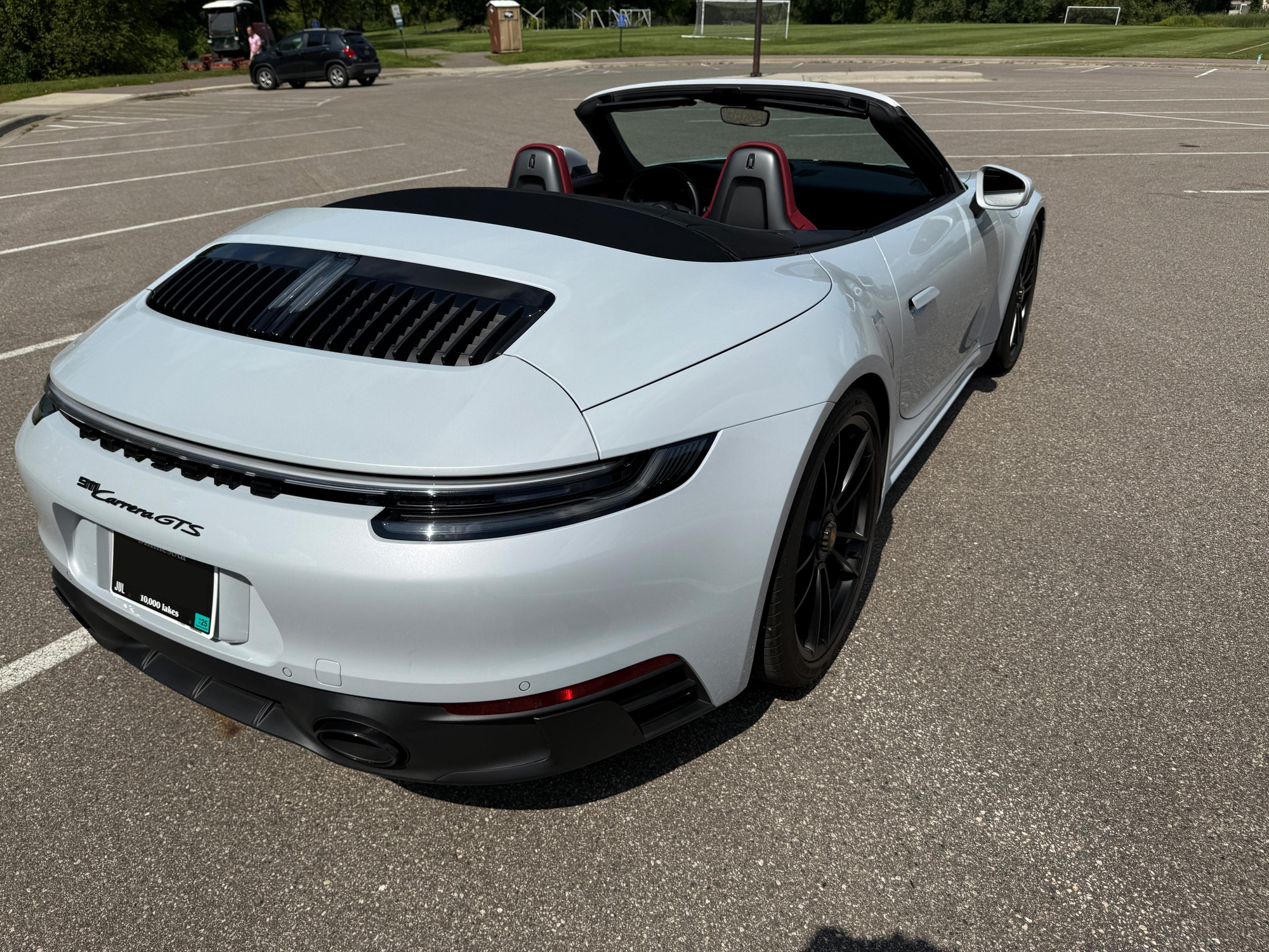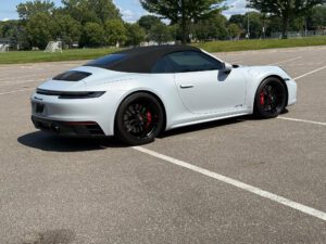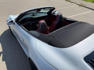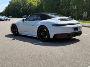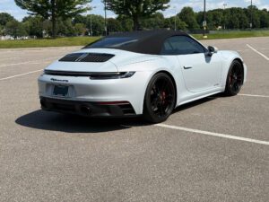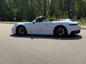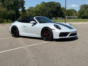 – THIS… is a 2023 Porsche 911 Carrera GTS Cabriolet, finished in Ice Grey Metallic with a black soft top and a Bordeaux Red and black interior.