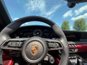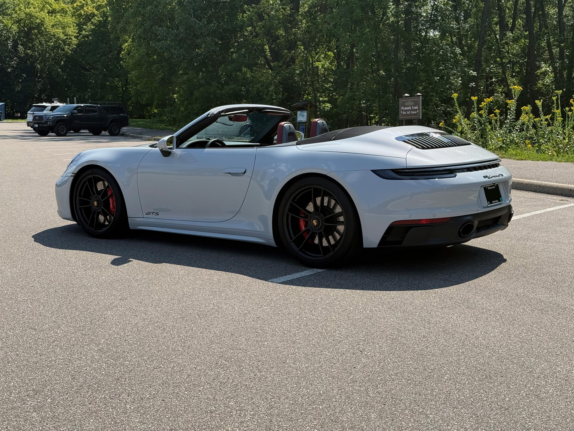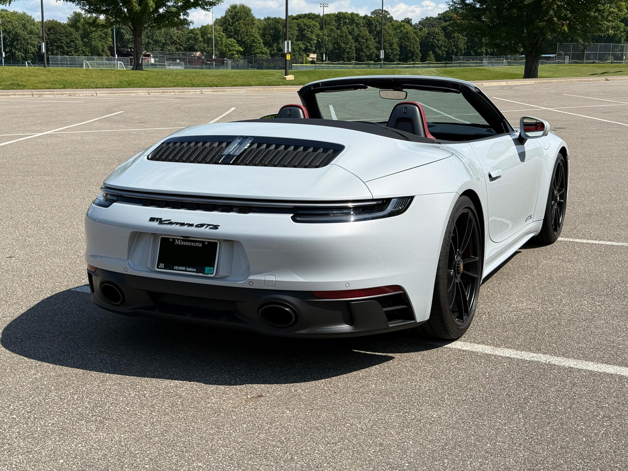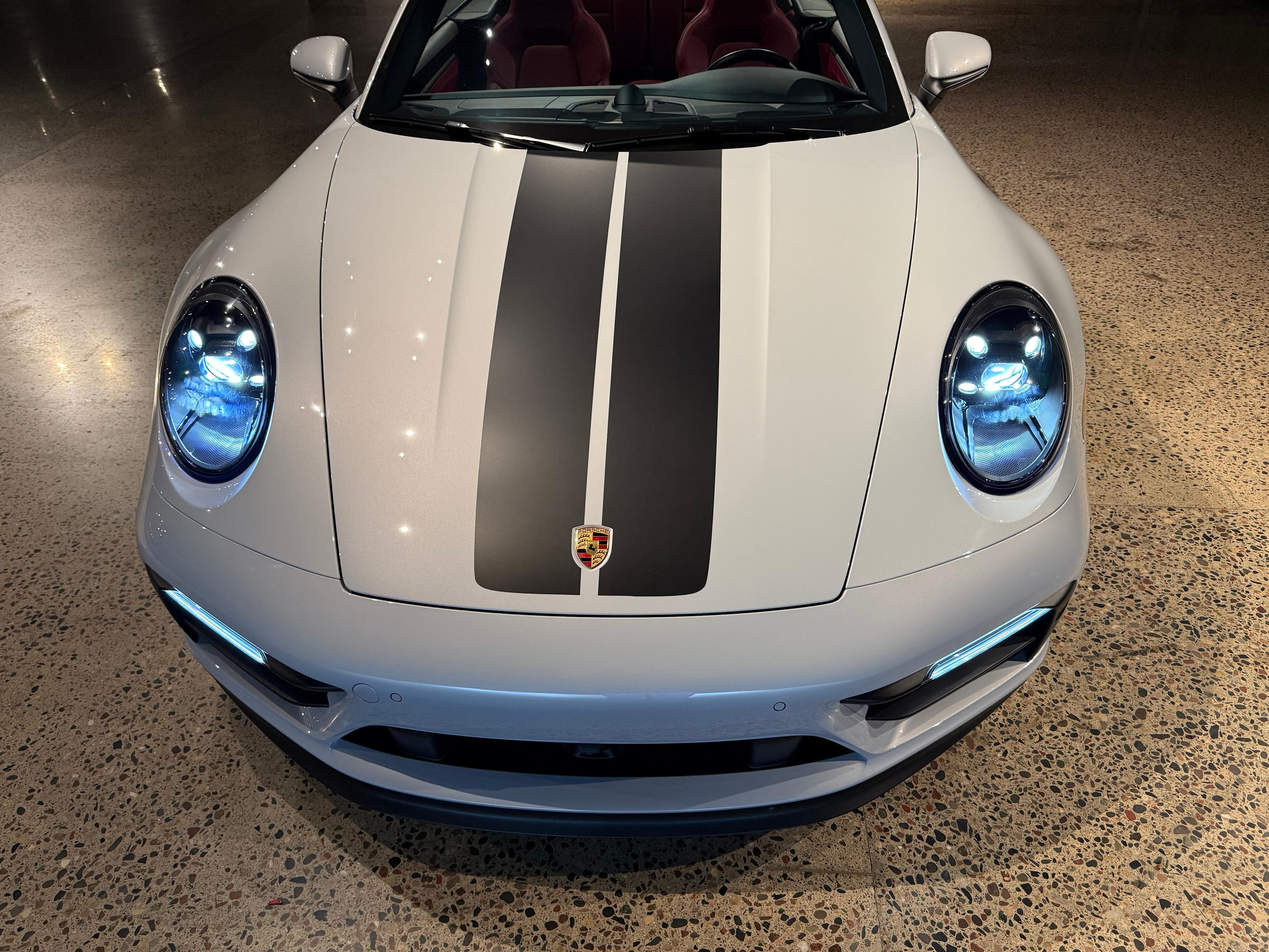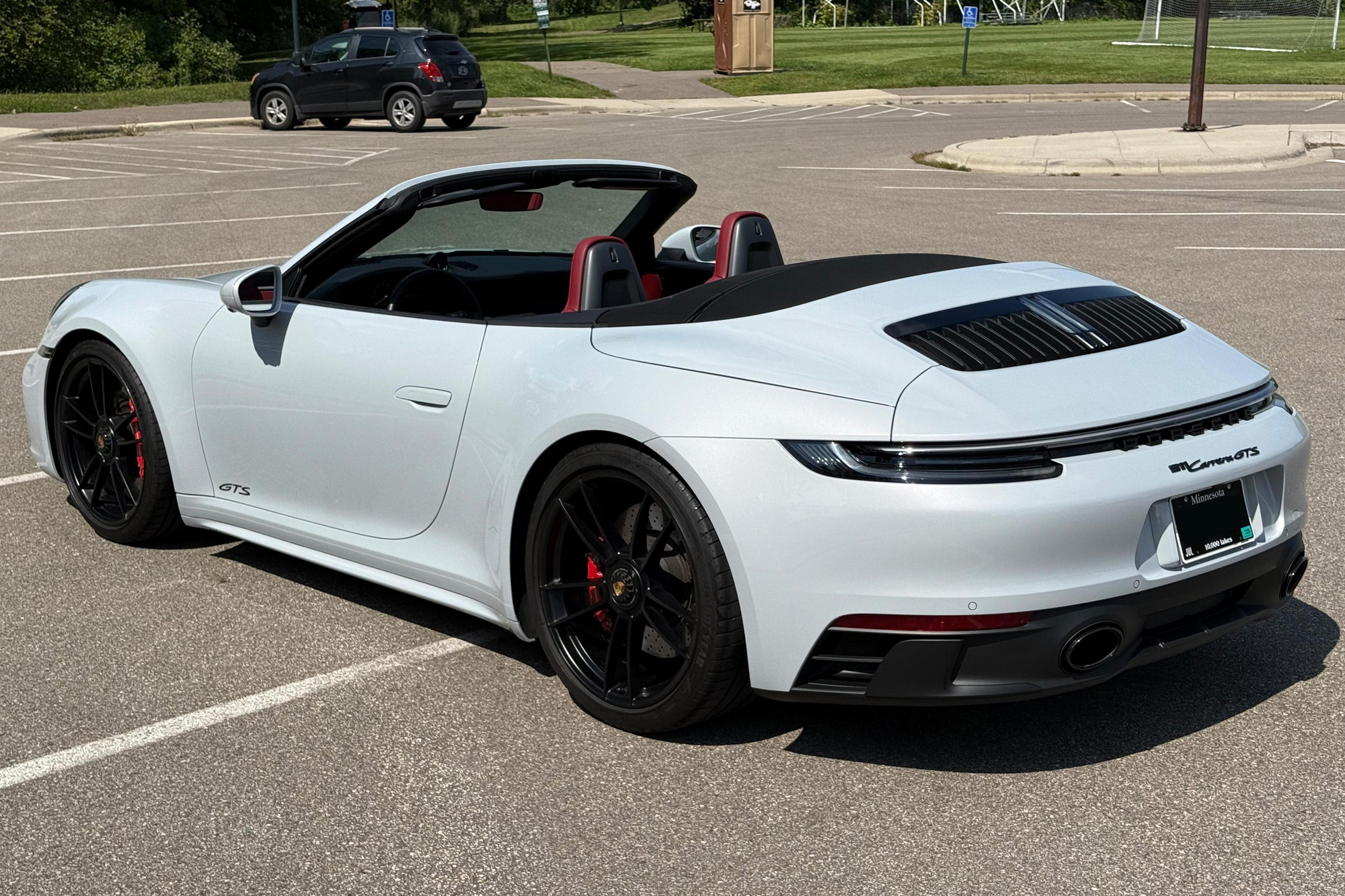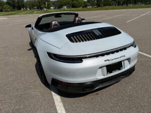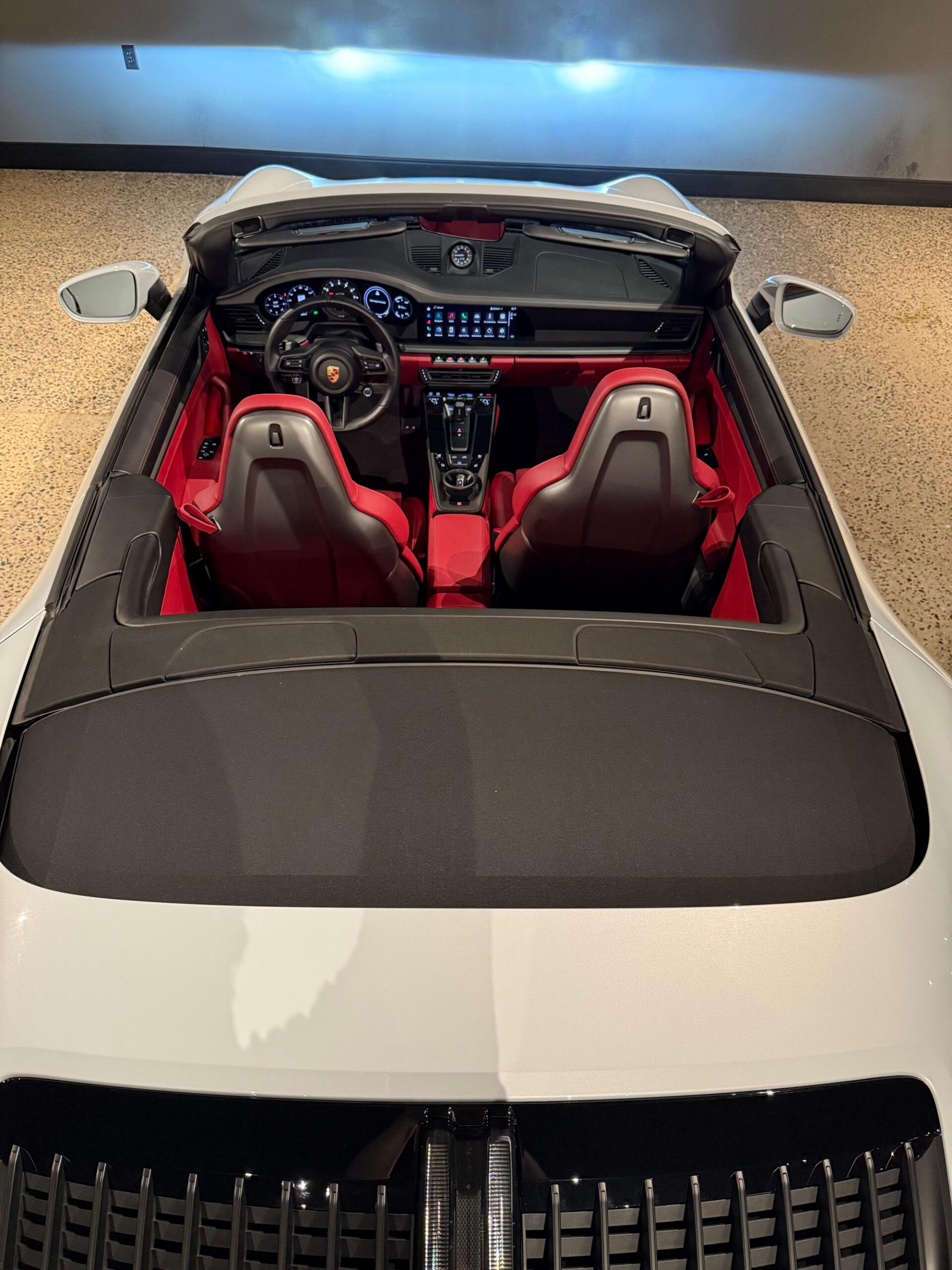– THIS… is a 2023 Porsche 911 Carrera GTS Cabriolet, finished in Ice Grey Metallic with a black soft top and a Bordeaux Red and black interior.