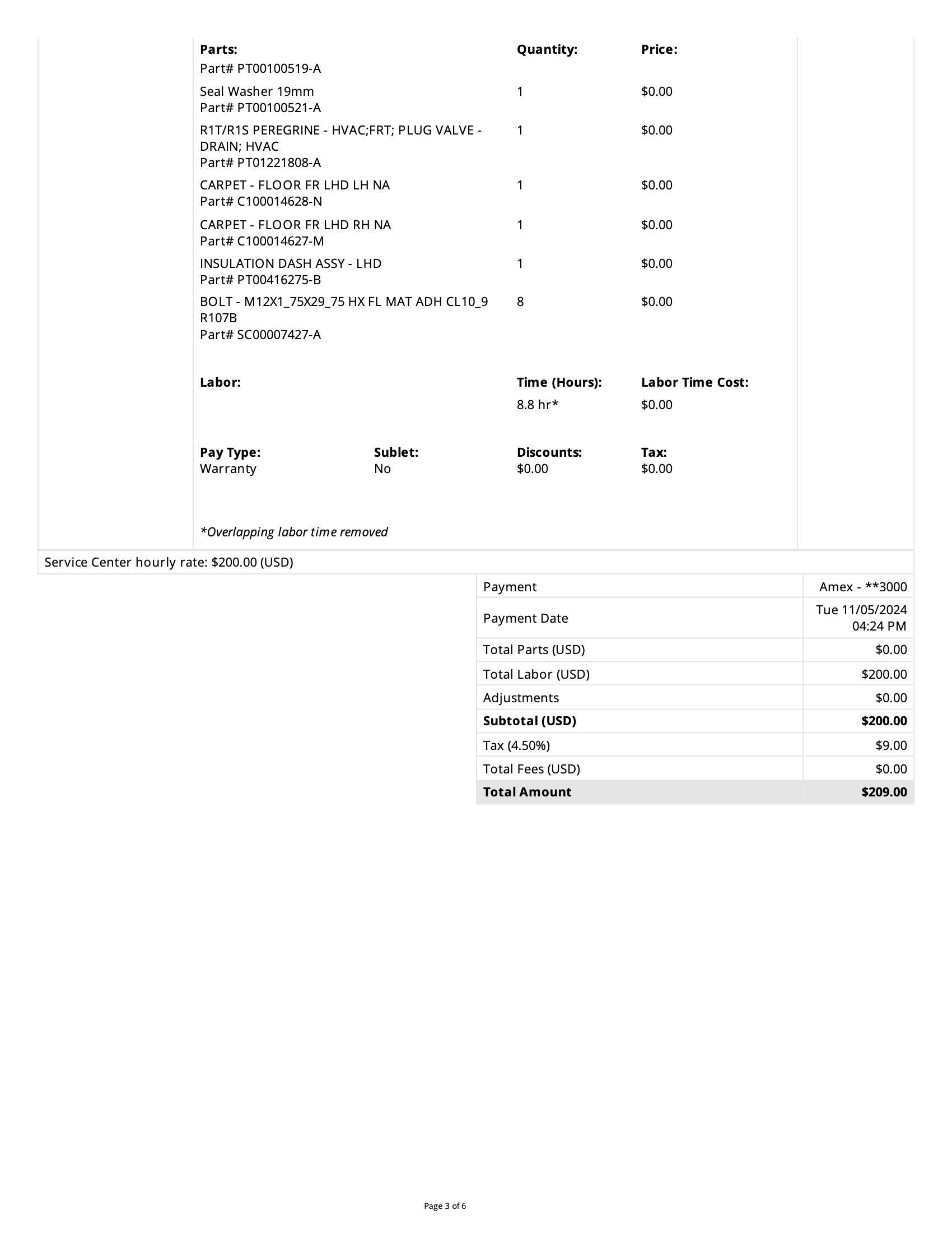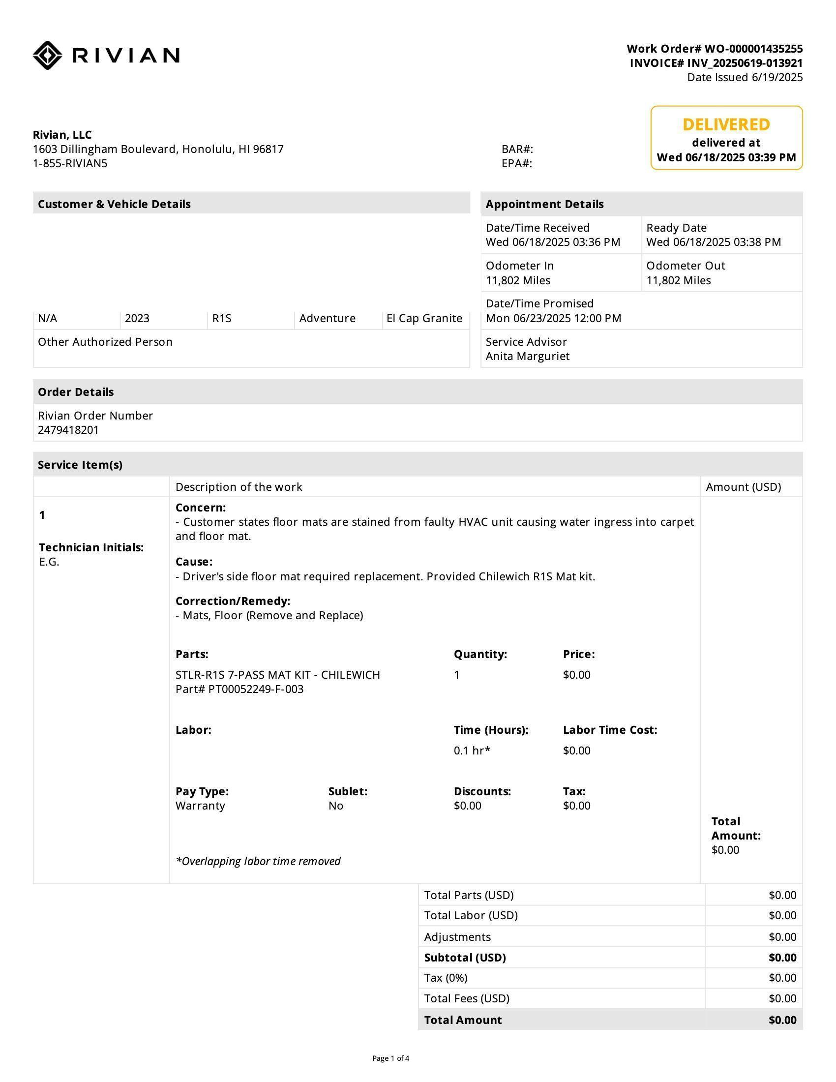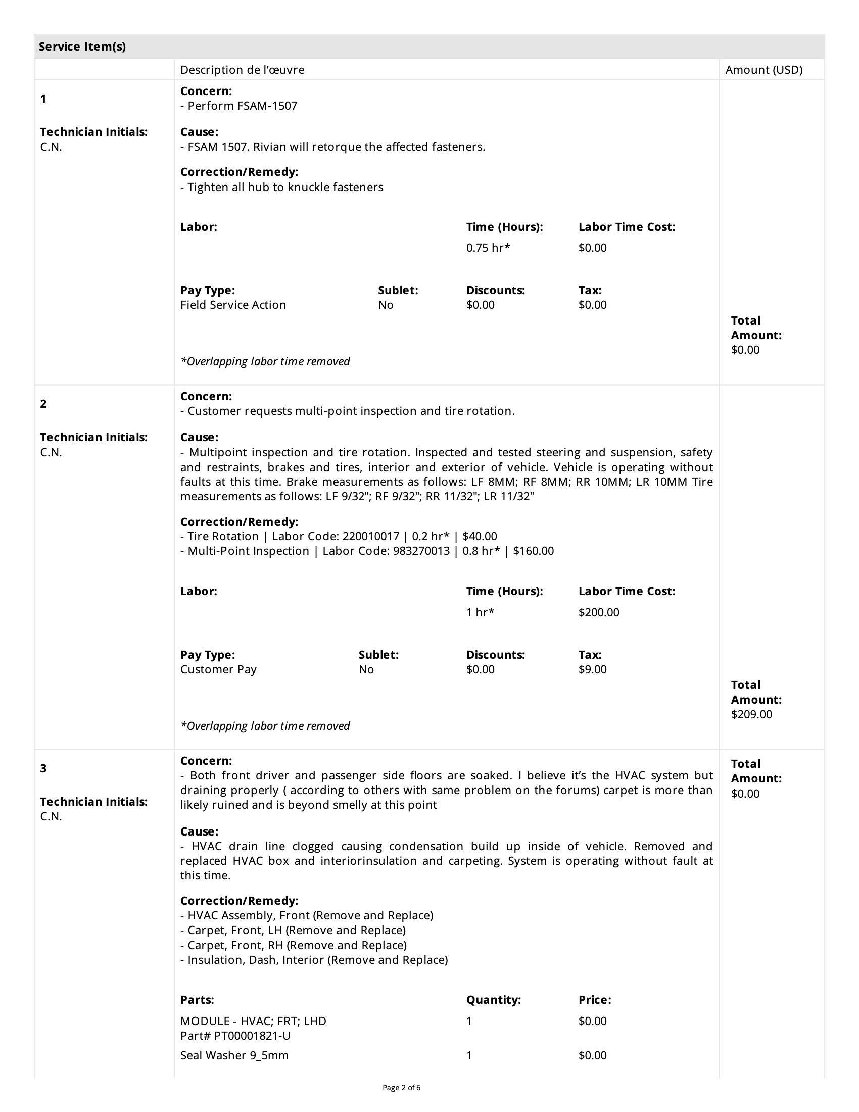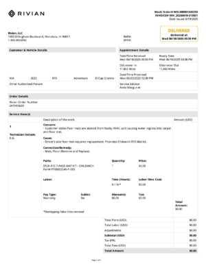 – June 2025 (11,587 miles): HVAC, drain valve, steering wheel, carpet, and dash insulation replaced